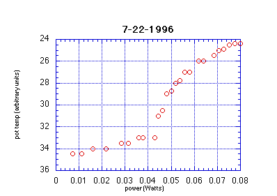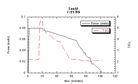 We put an overload of power on the pumped pot until the pot ran dry. We then reduced the power on the pot gradually and watched the pot refill. This test indicated that the pumped pot had a heat capacity of 60mW beyond the parasitic heat loads (see second figure below).