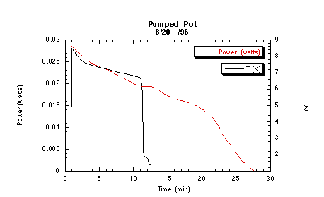 We put an overload of power on the pumped pot until the pot ran dry. We then reduced the power on the pot gradually and watched the pot refill. This test indicated that the pumped pot had a heat capacity of approximately 20mW beyond the parasitic heat loads (see second figure below).