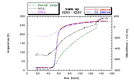 The above plot shows the temperatures of the various surfaces while the dewar was warming up.